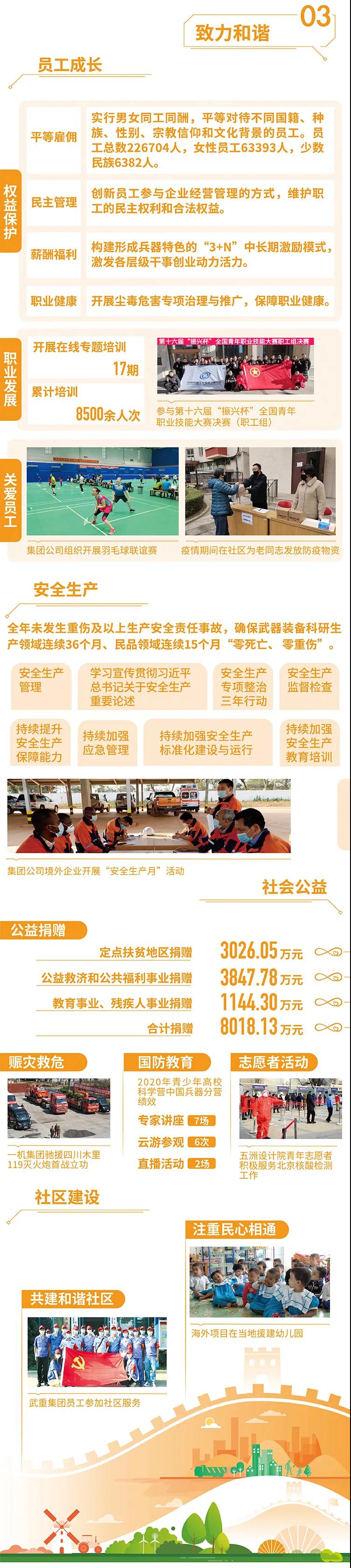 2020年,是“十三五”規(guī)劃收官之年,也是全面建成小康社會、實現(xiàn)第一個百年目標的決勝之年。集團公司黨組書記、董事長焦開河在報告開篇指出,集團公司實現(xiàn)了“十三五”圓滿收官,整體步入了高質量發(fā)展軌道,呈現(xiàn)出基礎更牢、動力更強、空間更大、效能更高的積極向上良好態(tài)勢。在“十三五”特別是近三年來的工作實踐中,我們明確了“集團公司是國家安全和國防建設的脊梁、是國家戰(zhàn)略科技力量最為重要的組成部分、是黨和國家最可信賴的‘六個力量’,肩負著支撐國防軍隊建設、推動科技自立自強、服務構建新發(fā)展格局的重大政治責任和光榮使命,具有極強的政治屬性,性質特殊、使命特殊、責任特殊”的新時代新階段職責使命,深化了對“堅持以習近平新時代中國特色社會主義思想定向領航,是集團公司高質量發(fā)展的根本遵循;保持貫徹落實習近平總書記重要指示批示和黨中央決策部署的戰(zhàn)略定力,是集團公司高質量發(fā)展的根本前提;履行好強軍這個首要職責,是集團公司高質量發(fā)展的根本要求;加快兵器科技創(chuàng)新突破,是集團公司高質量發(fā)展的根本支撐;加強黨的領導黨的建設,是集團公司高質量發(fā)展的根本保證”的兵器工業(yè)改革發(fā)展規(guī)律認識。 《報告》聚焦“抗疫斗爭中的‘兵器力量’”,生動展示了集團公司抗擊疫情的有力行動,展現(xiàn)了集中力量辦大事、急國家之所急的“兵器速度”,彰顯了“把一切獻給黨”的人民兵工精神和貫徹落實國家決策部署的責任擔當?!秷蟾妗芬浴坝眯氖睾蚝推健⒂们闇嘏鐣睘橹黝},從恪守本責、共創(chuàng)價值、致力和諧、踐行綠色、責任管理五個維度,全面展現(xiàn)集團公司在堅持履行政治責任、經濟責任、社會責任,履行強軍首責、加強黨的建設、打造國家戰(zhàn)略科技力量、推進“一帶一路”倡議、打好打贏三大攻堅戰(zhàn)、深化改革、助力員工成長、支持社會公益事業(yè)、提升社會責任管理等方面的生動實踐和履責亮點,凸顯集團公司保持貫徹落實黨中央決策部署的戰(zhàn)略定力、在聚焦主責主業(yè)、科技引領、國際化經營上持續(xù)用力,為實現(xiàn)第一個百年奮斗目標貢獻力量的初心與行動。《報告》再次獲得中國企業(yè)社會責任報告評級專家委員會“五星佳”最高評級,兵器工業(yè)集團成為軍工行業(yè)唯一連續(xù)10年獲得最高評級的企業(yè)。 2021年是開啟新征程的開局之年,也是建黨100周年、人民兵工創(chuàng)建90周年,兵器工業(yè)集團將全面貫徹落實黨中央戰(zhàn)略部署,緊扣推動高質量發(fā)展主題,圍繞“十四五”開好局、起好步,堅決完成黨中央賦予的職責使命,履行好中央企業(yè)和軍工集團的政治責任、經濟責任、社會責任,為實現(xiàn)中國夢強軍夢作出新的更大貢獻! 一圖看懂《中國兵器工業(yè)集團有限公司2020年社會責任報告》